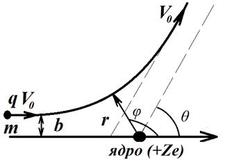 Рис. 3.5. Резерфордовское рассеяние На рис. 3.5 показана траектория отклонения α -частицы при попадании в кулоновское поле ядра. Резерфорд показал, что угол отклонения α -частицы зависит от величины так называемого прицельного параметра b. Можно рассчитать минимальный прицельный параметр b, при котором частица отклонится от прямолинейной траектории, то есть ощутит действие поля ядра: