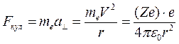где b - прицельный параметр, θ - угол рассеяния. Угол θ также называют углом рассеяния. Из формулы (3.3) видно, что чем меньше b, тем больше угол рассеяния. Если θ > 0, следовательно, частица претерпевает рассеяние. Было очевидно, что отклонение происходит в результате взаимодействия α -частиц с зарядами, входящими в состав атома. Поскольку столкновение с электроном не может вызвать заметного изменения траектории α -частицы (ее масса в 7000 раз больше массы электрона), Резерфорд пришел к выводу, что сильное отклонение направления движения α -частицы от первоначального происходит в результате ее столкновения с положительно заряженной частью атома. Причем весь положительный заряд сконцентрирован в области, названной ядром и не превышающей 10–12 см. Электроны для поддержания устойчивого равновесия должны находиться в постоянном движении вокруг ядра в области размером порядка 10–8 см. Резерфорд предложил, что электроны вращаются по замкнутым траекториям вокруг ядра как планеты вокруг Солнца. Эти идеи представляют суть ядерной модели атома Резерфорда, которая в качестве приближенной модели не потеряла значения до наших дней. Однако рассмотрение атома по этой модели с опорой на классическую электродинамику предсказывает следующий результат: электрон двигается по искривленной орбите вокруг ядра, центростремительное ускорение электрона определяется кулоновской силой, действующей на электрон со стороны положительного ядра: