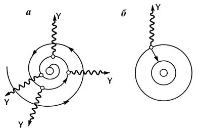 где Ze – заряд ядра атома, при Z = 1 такая система соответствует атому водорода, при иных Z – водородоподобному иону – атому с зарядом ядра Z, у которого удалены все электроны, кроме одного. Итак, движение электрона будет заведомо ускоренным, а согласно законам классической электродинамики ускоренно движущийся электрон должен непрерывно испускать электромагнитные волны. В частности при равномерном движении электрона по окружности частота излучения будет равна циклической частоте, при более сложных видах движения должно наблюдаться наложение нескольких монохроматических частотных компонентов. Излучение атома будет сопровождаться уменьшением энергии системы, а вместе с ней будет уменьшаться радиус вращения электрона и период его обращения, что в свою очередь приведет к уменьшению частоты излучения (рис. 3.6.а). Такая система будет излучать непрерывный спектр, и через 10–11с вследствие потери энергии электрон упадет на ядро, т.е. атом как таковой прекратит свое существование. Эти выводы не имеют ничего общего с экспериментальными данными.