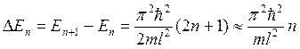 а) б) в) Рис. 5.2. а) энергетический спектр (первые 5 состояний) частицы в потенциальной яме шириной L; б) волновая функция частицы в первых трех состояния; в) квадрат волновой функции частицы = вероятность нахождения частицы в определенной точке потенциальной ямы в первых трех состояниях Такое поведение микрочастиц иллюстрирует тот факт, что к ним не применимо понятие траектория. В частности в состоянии n = 2 частица «перемещается» из левой части ямы в правую и при этом не проходит через «середину» этой ямы. Оценим расстояние между уровнями:
