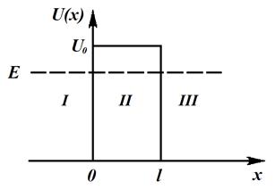 Рассмотрим движение частицы при прохождении потенциального барьера. Пусть она движется слева направо и встречает на своем пути потенциальный барьер высотой U0 и шириной l (рис. 6.1). Согласно классической теории, если энергия частицы больше высоты барьера (E > U0), то она беспрепятственно пройдет над барьером.