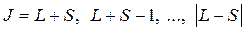 где S, а следовательно и спин атома, может быть как целым, так и полуцелым, в зависимости от того, четное или нечетное число валентных электронов в атоме: – при четном числе электронов S принимает значение от 0 (если спины попарно компенсируют друг друга) до N/2 (если все спины параллельны друг другу), – при нечетном числе электронов минимальное S может быть равно 1/2 (когда все кроме одного спины компенсируют друг друга), максимальное S = N/2 (когда все спины параллельны); число L складывается из квантовых чисел l и может принимать целое значение от 0 (когда l всех электронов равно нулю) до N∙ (n – 1), где n – главное квантовое число валентного уровня, N – число валентных электронов. Состояние атома полностью описывается тремя квантовыми числами L, S, J. Для обозначения определенных состояний атома используют схематическую запись: Вместо численных значений квантового числа L принято использовать прописные буквенные обозначения: S, P, D, E, F и далее по алфавиту (см. обозначения для атома водорода). В случае, когда S < L, (2 S +1) задает мультиплетность энергетического уровня. Если S > L, мультиплетность равна (2 L +1), однако в верхнем индексе все равно указывается S, чтобы не утерять информацию о спиновом состоянии атома. Так же, как для атома водорода, момент импульса многоэлектронного атома может иметь строго определенные направления в пространстве, поэтому проекция момента импульса на заданное направление квантуется по правилу: где квантовое число mJ может принимать значения mJ = 0, ±1, ±2,..., ± J, и при переходах атома между состояниями подчиняется правилу отбора: