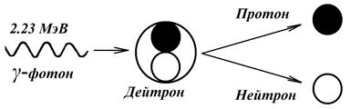 Рис. 13.4. Реакция деления дейтрона (ядра дейтерия) Эксперименты по расщеплению ядер показали, что для разрушения дейтрона фотон γ -излучения должен иметь энергию не менее 2.23 МэВ (рис. 13.4). Энергия связи меняется от 2.23 МэВ для дейтрона (самого легкого составного ядра) до 1640 МэВ для Так как для расщепления ядра необходимо затратить энергию, равную энергии связи, то реакция синтеза ядер из отдельных нуклонов должна сопровождаться выделением той же самой энергии. Изменение энергии полученной системы оказывается эквивалентным изменению массы полученной системы:
