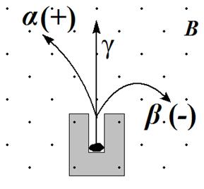 Рис. 14.1. Опыт Резерфорда. Влияние магнитного поля на α -, β -, γ -излучения. Радиоактивность ядер, синтезированных с помощью ядерных реакций в лабораториях, называют искусственной. Различия между естественной и искусственной радиоактивностью не существует, законы происходящих при этом процессов у них одинаковы. Основными характеристиками радиоактивного распада являются: время протекания (период полураспада), тип испускаемых частиц, энергия частиц – продуктов распада, направления вылета частиц – продуктов распада. Отдельные радиоактивные ядра претерпевают превращение независимо друг от друга. Поэтому можно считать, что количество ядер dN, распадающихся за малый промежуток времени dt, пропорционально как числу имеющихся ядер N, так и промежутку времени dt: