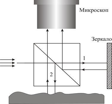 Оптические измерительные приборы, действие которых основано на использовании явления интерференции света, называют интерферометрами. Для получения двух когерентных световых пучков в интерферометрах используют светоделитель, выполненный либо в виде полупрозрачного зеркала, либо в виде призмы-куба с полупрозрачной гипотенузой. Светоделитель расщепляет световую волну на две части – отраженную и прошедшую через него. Полученные таким образом когерентные волны проходят различные оптические пути, отражаются от специальных зеркал и с помощью того же светоделителя направляются в объектив микроскопа или зрительной трубы, с помощью которых и наблюдают интерференционную картину. На рис. 1.8 показана оптическая схема интерферометра Линника. В качестве светоделителя в интерферометре используется призма-куб с полупрозрачной гипотенузой. Роль одного из зеркал выполняет изучаемая поверхность.