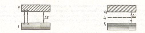 Проводимость полупроводников всегда является возбужденной, т. е. появляется только под действием внешних факторов (температуры, облучения, сильных электрических полей и т. д.). В собственном полупроводнике уровень Ферми находится в середине запрещенной зоны (рис. 316). Действительно, для переброса электрона с верхнего уровня валентной зоны на нижний уровень зоны проводимости затрачивается энергия активации, равная ширине запрещенной зоны Вывод о расположении уровня Ферми в середине запрещенной зоны собственного полупроводника может быть подтвержден математическими выкладками. В физике твердого тела доказывается, что концентрация электронов в зоне проводимости