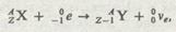 в ее процессе электронио-позитронная пара превращается в два у-кванта, причем энергия пары переходит в энергию фотонов. Появление в этом процессе двух у-квантов следует из закона сохранения импульса и энергии. Реакция (263.3) подтверждена прямыми экспериментами под руководством российского ученого Л. А. Арцимовича (1909—1973). Процессы (263.2) и (263.3) — процессы возникновения и превращения электронно-позитронных пар — являются примером взаимосвязи различных форм материи: в этих процессах материя в форме вещества превращается в материю в форме электромагнитного поля, и наоборот. Для многих ядер превращение протона в нейтрон, помимо описанного процесса (263.1), происходит посредством электронного захвата, или е-захвата, при котором ядро спонтанно захватывает электрон с одной из внутренних оболочек атома (К, L и т. д.), испуская нейтрино: Необходимость появления нейтрино вытекает из закона сохранения спина. Схема е-захвата: