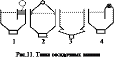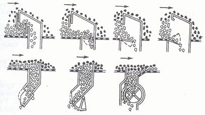 Сжатый воздух поступает в воздушное отделение периодически через пульсаторы различных типов (роторные, клапанные и др.), устанавливаемые по одному на каждую камеру; также периодически воздух выпускается из воздушного отделения в атмосферу. При впуске воздуха уровень воды в воздушном отделении понижается, а в отсадочном отделении, естественно, повышается (это сообщающиеся сосуды); при выпуске воздуха происходят обратные явления. Благодаря этому совершаются колебательные движения в отсадочном отделении. Выпускается достаточно большое количество видов беспоршневых отсадочных машин, пригодных для обогащения мелких, крупных и ширококлассифицированных (содержащих и крупные и мелкие классы) материалов. Машины имеют различное количество камер (обычно до пяти) и различные площади решета (обычно до 24 м2). Расход электроэнергии при обогащении на диафрагмовых отсадочных машинах 0,3-0,5 кВт×ч/т, на беспоршневых – 0,5-0,75 кВт×ч/т (вместе с воздуходувкой). Разгрузочные устройства тяжелых крупных продуктов имеют различные конструкции (рис.13). Отечественные отсадочные машины в горизонтальном сечении имеют прямоугольную форму, а ряд зарубежных машин – круглую. В последних питание подается в центр машины и расслоение осуществляется в камерах-секторах.