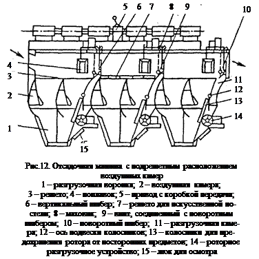 Воздушно-пульсационные (беспоршневые) отсадочные машины отличаются от других использованием сжатого воздуха для создания колебаний воды в отсадочном отделении. Машины имеют воздушное и отсадочное отделения и снабжены универсальным приводом, обеспечивающим симметричный и асимметричный циклы отсадки и возможность регулирования подачи воздуха в камеры. Основное преимущество беспоршневых машин заключается в возможности регулирования цикла отсадки и достижении высокой точности разделения при повышенной постели. Эти машины применяются в основном для обогащения углей, реже руд черных металлов. Машины могут иметь боковые подрешетные (рис.12) или патрубочные подрешетные воздушные камеры. При боковом расположении воздушных камер равномерность пульсаций воды в отсадочном отделении сохраняется при ширине камер не более 2 м. Для обеспечения равномерного распределения поля скоростей пульсирующего потока по площади отсадочного решета в современных конструкциях отсадочных машин применяют гидравлические обтекатели на конце перегородки между воздушным и отсадочным отделением.