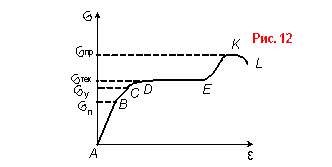 АВ – упругая деформация (выполняется закон Гука) ВС - остаточные деформации очень малы DЕ – область текучести КL - разрушение