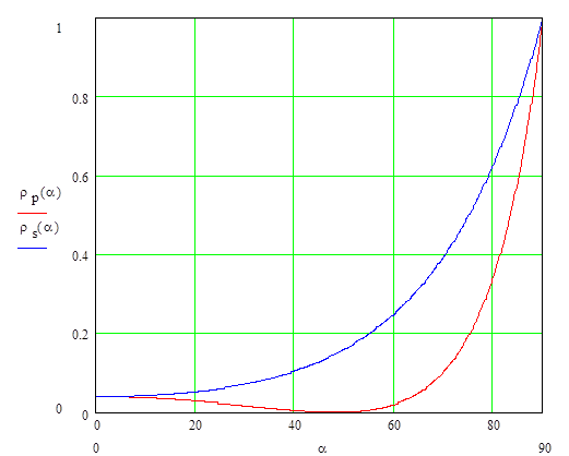 Если падающее излучение неполяризовано (p – компонента и s – компонента равны и некогерентны), то отраженное излучение за счет неравенства коэффициентов отражения будет частично поляризовано: преимущественные колебания вектора Е будут происходить в направлении, перпендикулярном плоскости падения. Степень поляризации отраженного излучения определяется соотношением