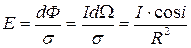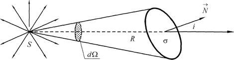 показывающее количество световой энергии, протекающей через площадку σ за единицу времени (мощность сквозь поверхность σ), называется потоком световой энергии через поверхность σ. Так как световая энергия в однородной среде распространяется прямолинейно, то, проведя из точки S совокупность лучей, опирающихся на контур площадки σ, мы получим конус, ограничивающий поток, протекающий через σ. Если внутри среды поглощением энергии можно пренебречь, то через любое сечение этого конуса протекает один и тот же поток. Сечение конуса сферической поверхностью с центром в S и с радиусом, равным единице, дает меру телесного угла конуса dσ. Если нормаль N к поверхности σ составляет угол i с осью конуса, а расстояние от S до площадки есть R, то