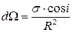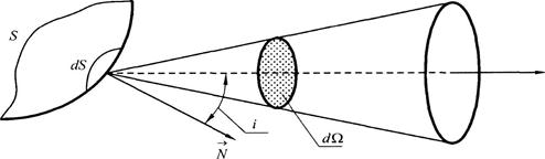 Поверхностная яркость В есть величина, характеризующая излучение светящейся поверхности по данному направлению, определяемого углом i с нормалью к рассматриваемому элементу светящейся поверхности. Выделим пучок, опирающийся на элемент поверхности σ и образующий телесный угол dΩ; ось пучка составляет угол i с нормалью N к поверхности σ (рисунок 2). Видимая поверхность элемента в направлении оси есть σ ·cos i. Пусть поток, посылаемой ею в телесный угол dΩ, равен dФ. Очевидно, он пропорционален видимой поверхности излучателя σ ·cos i и величине телесного угла dΩ. Коэффициент пропорциональности зависит от свойств излучающей поверхности и может быть различным для различных направлений углов i относительно нормали. Обозначив этот коэффициент через Вi, получим