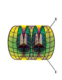 ∑∑Сmn = n!/m!(n-m)! (2.3.3) M≤n где: n — максимальное количество материй данного типа квантования мерности, с коэффициентом квантования γi, которые образуют пространства-вселенные в данной зоне внутреннего колебания мерности матричного пространства. Чаще всего количество пространств-вселенных, образующих данную метавселенную, меньше максимального. И, чем дальше от центра зоны смыкания матричных пространств, тем больше отличие между возможным и реальным количеством пространств-вселенных, образующих данную метавселенную. Чем дальше от центра, тем больше «свободных мест». Дело в том, что условия квантования мерности данной зоны колебания мерности являются лишь необходимыми условиями для образования пространств-вселенных. Достаточным это условие становится только тогда, когда в эту зону внутреннего колебания мерности матричного пространства попадает необходимая масса материй для синтеза этих пространств-вселенных. Хотя, масса материй, «выброшенных» из зоны смыкания матричных пространств во время сверхвзрыва, огромная, но, всегда, конечная величина. Этой массы хватает для образования конечного числа пространств-вселенных. После супервзрыва зона смыкания матричных пространств уменьшается, что приводит к уменьшению массы приходящей материи. Со временем, этот процесс приходит к некоторому, определённому, балансному уровню. В результате сверхвзрыва, образуется система метавселенных, которую условно назовём суперпространство первого порядка, которое образуется слиянием девяти форм материй (Рис. 2.3.6) Искривление, возникающее при смыкании двух матричных пространств, неодинаково в разных направлениях. А это означает некоторое отличие, как формы, так и качественного состава возникающих в этих зонах метавселенных. Таким образом, возникает неравномерное распределение материй в разных на-правлениях. Это, в свою очередь, приводит к различной степени вторичного влияния на мерность матричного пространства возникающими метавселенными в соответствующих зонах. Искривление, возникающее в момент сверхвзрыва имеет и разный знак по оси, проходящей через зону смыкания матричных пространств. Поэтому, возникающие в этих внутренних зонах искривления матричного пространства метавселенные, вызывают вторичное искривление мерности во встречных направлениях, параллельно всё той же оси, проходящей через зону смыкания матричных пространств. Это встречное прогибание с двух сторон, по мере образования метавселенных, приводит к смыканию вторичного искривления матричного пространства в зоне балансной мерности матричного пространства, которая была до сверхвзрыва. Таким образом, в результате эволюции описанных выше процессов, возникает замкнутая система метавселенных — суперпространство первого порядка. В нашем матричном пространстве встречное смыкание, возникшее вследствие влияния метавселенных на мерность матричного пространства, возникает в метавселенных образованных девятью формами материй. Суперпространство, при этом, смыкается, как створки раковины моллюска. Перетекающие через зону смыкания матричных пространств формы материи, не имеют очередной зоны искривления мерности матричного пространства, в которой они могли бы слиться. Такие зоны возникают лишь в случае, когда две зоны смыкания матричных пространств одного знака во