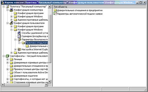 ИТ-инфраструктура предприятия может включать интрасети, сайты в интернете и экстрасети. Многие компоненты такой инфраструктуры являются потенциально уязвимыми перед попытками неавторизованного доступа со стороны злоумышленников. Контроль и управление идентификацией пользователей может быть осуществлен на базе инфраструктуры открытых ключей. Инфраструктура открытых ключей PKI (public key infrastructure) – это системы цифровых сертификатов, центров сертификации CA (certification authorities) и других центров регистрации RA (registration authorities), которые идентифицируют (проверяют подлинность) каждой стороны, участвующей в электронной транзакции, с применением шифрования открытым ключом (public key). В Microsoft Server 2003 политику открытых ключей можно задавать с помощью оснастки MMC - Политика открытого ключа (рис. 7.4)