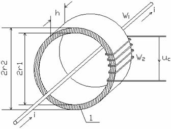 W1 – первичная обмотка (шина с синусоидальным током); W2 – вторичная или выходная обмотка; uс – выходной сигнал; 1– железный (стальной) короткий отрезок трубы или кольцо, выточенное из прутка обыкновенной стали широкого применения. Рис. 1. Установим связь между выходным напряжением uс и током i. При этом будем полагать, что сердечник имеет однородную структуру и линейную зависимость: B = f (H), где B – магнитная индукция; H – напряженность магнитного поля. Считаем, что магнитная проницаемость сердечника m = const, причем m >> m0 (m0 = 4