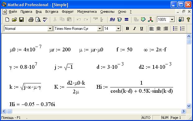 Работа в среде математического процессора MathCad начинается с его запуска и открытия рабочего листа. Обычно в начале – с левой верхней части пространства рабочего листа MathCad с помощью стандартного оператора назначения константам присваиваются постоянные, а переменным – их временные значения величин. При работе с комплексными величинами необходимо производить назначение символу Удаление неверных записей осуществляется через меню «Правка» или с помощью клавиш «Ctrl/D». Правее и ниже первых записей в пространство рабочего листа с помощью клавиатуры или через панель инструментов заносятсяформульные выражения. Если их несколько, то итоговое выражение заносится последним. Пример такой записи приведен на рис. 2.