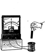 Вариант 1. Оборудование: (рис.5,6,7) гальванометр от демонстрационного амперметра и вольтметра, полосовой или дугообразный магнит, проводящий контур в виде катушки от универсального трансформатора (рис.5) или соединительного провода (рис.6), или мотка от прибора по демонстрации магнитного поля кругового тока (рис.7) Соберите установки по рисункам 5,6,7 из имеющегося оборудования на столе, продумайте способ получения индукционного тока с помощью магнитного поля постоянного магнита в каждом из вариантов. Изменением параметров установок добейтесь максимального отклонения стрелки гальванометра.