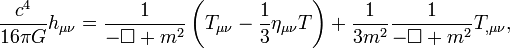 где Вообще корень проблемы лежит в разложении массивного поля спина 2 по спиральностям и их взамодействии с веществом. При стремлении массы поля к нулю компоненты спиральности Более подробный разбор, не ограничивающийся линеаризованным приближением, проведён в работах