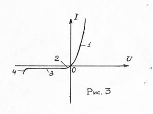 Вольт-амперная характеристика, построенная по формуле (1), показана на рис. 3 и имеет несколько характерных участков: 1 – ветвь пропускного направления, 2 – начальный участок запирающего направления (быстрый рост обратного тока); 3 – прямолинейный участок насыщения, 4 – участок резкого увеличения обратного тока, предшествующий электрическому пробою.