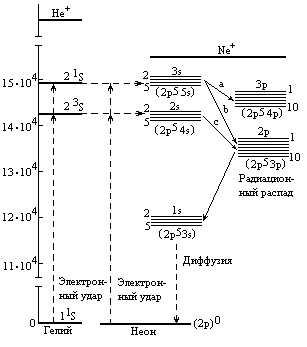 Атом неона, имеющий на внешней оболочке на шесть электронов больше, чем гелий, обладает крайне сложной схемой возбужденных состояний. Энергии двух из этих состояний почти точно совпадают со значениями энергии для двух из метастабильных состояний гелия. Если энергии настолько близки, то соударение атома гелия с неоном может приводить к эффективной передаче энергии от атома гелия в метастабильном состоянии к атому неона в основном состоянии. Столкновение, которое приводит к такому типу передачи энергии, называется резонансным соударением. Схема энергетических уровней гелия и неона показана на рис. 1.