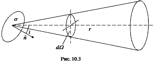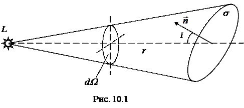 определяющее количество световой энергии, протекающей через площадку s за единицу времени (то есть, фактически, мощность, переносимая сквозь поверхность s), называется потоком световой энергии через поверхность s. Так как световая энергия в однородной среде распространяется прямолинейно, то, проведя из точки L (рис. 10.1) совокупность лучей, опирающихся на контур площадки s, мы получим конус, ограничивающий поток, протекающий через s. Если внутри среды поглощением энергии можно пренебречь, то через любое сечение этого конуса протекает один и тот же поток. Сечение конуса сферической поверхностью с центром в L и с радиусом, равным единице, дает меру телесного угла конуса dW. Если нормаль