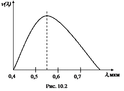 причем интеграл берется по полному телесному углу 4 p. Функция видности. Поток энергии характеризует свет с энергетической точки зрения. Однако он недостаточен для оценки субъективного ощущения, вызванного светом. Инфракрасные (более 0,76 мкм) и ультрафиолетовые (менее 0,38 мкм) лучи вовсе не вызывают зрительного ощущения, даже если их интенсивность велика. Глаз человека не одинаково чувствителен к видимым лучам различного цвета. Так, мощность лучей красного цвета должна быть значительно больше (~ в 10 раз) мощности лучей зелёного цвета, чтобы вызвать ощущение одинаковой интенсив-ности. Величина, характеризующая среднюю относительную чувствительность глаза к световым волнам разных длин, называется функцией видности. Зависимость функции видности n(l) от длины волны показана графически на рис. 10.2. Из рисунка видно, что глаз обладает наибольшей чувствительностью к зеленым лучам с длиной волны 0,555 мкм.