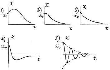 Отметьте правильный ответ. -: 1); -: 2); +: 3); -: 4); -: 5) I: 194. S: Тело массы m = 0,25 кг, подвешенное на пружине жёсткости с = 144 Н/м, находится в состоянии статического равновесия в среде с сопротивлением. Сила сопротивления пропорциональна первой степени скорости, | F сопр| = bּv. Коэффициент сопротивления равняется b = 12 (Нּс/м). Тело отклонили от положения равновесия на расстояние x 0 = 0,1 м и сообщили ему начальную скорость, направленную в противоположную сторону,