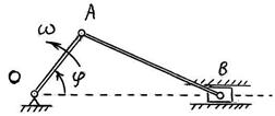 +: 3 I: 226. S: Кривошипно-ползунный механизм прикреплён к станине массы M, установленной на гладком горизонтальном фундаменте. Масса ползуна B механизма равна m, причём M = 9ּ m. Пренебрегая массой звеньев OA и AB, длины которых соответственно OA = l, OA и AB = 2ּ l, найти максимальное значение v max скорости станины, если кривошип вращается с постоянной угловой скоростью ω и при t = 0 угол φ = 0 и начальная скорость станины равна нулю.
