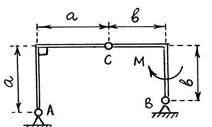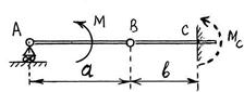 S: Определить момент реактивной пары М С в заделке С составной конструкции, изображённой на рис. и находящейся под действием пары сил с моментом М = 600 (Нм); a = 3 (м), b = 2 (м). (Весом конструкции пренебречь.)