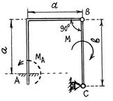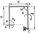 S: Определить момент реактивной пары МА в заделке А составной конструкции, изображённой на рис. и находящейся под действием пары сил с моментом М = 1700 (Нм); a = 3,0 (м), b = 3,5 (м) (результат округлить до ближайшего целого числа). Весом конструкции пренебречь.