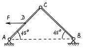S: Определить реакцию RА в шарнире А составной конструкции, изображённой на рис. и находящейся под действием силы F = 950 (Н), приложенной в середине стержня АВ в точке D (результат округлить до ближайшего целого числа). RА = … (Н).