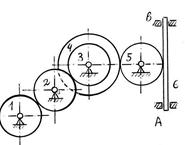 S: В механизме движение от шестерни 1 передаётся шестерням 2, 3, 4, 5 и зубчатой рейке АВ. Определить модуль и направление скорости рейки, если ω 1 = 2 рад/с и радиусы зубчатых колёс R 1 = R 2 = R 3 = R 5 = 0,2 м, R 4 = 0,3 м.