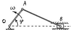 +: 3 I: 236. S: Два вагонамасс m 1 = 20 тонн и m 2 = 30 тонн, двигавшиеся навстречу друг другу по горизонтальному прямолинейному участку пути со скоростями v 1 = 3 м/с и v 2 = 2,5 м/с соответственно, сцепляются после соударения. Пренебрегая сопротивлениями движению, определить модуль скорости v сцепа; v = … (м/с). +: 0,3 I: 247. S: Снаряд массы m = 12 кг, летевший со скоростью v = 800 м/с, разорвался в воздухе на 240 равных по массе осколков. Разлёт осколков в системе отсчёта, связанной с первоначальным снарядом, является сферически симметричным, и скорость каждого осколка в этой системе отсчёта равна v отн = 600 м/с. Модуль количества движения системы осколков относительно земли равен … (кгּм/с). +: 9600 I: 238. S: Кривошипно-ползунный механизм прикреплён к станине массы M, установленной на гладком горизонтальном фундаменте. Масса ползуна B механизма равна m, причём M = 9ּ m. Пренебрегая массой звеньев OA и AB, длины которых соответственно OA = l, OA и AB = 2ּ l, найти максимальное значение v max скорости станины, если кривошип вращается с постоянной угловой скоростью ω и при t = 0 угол φ = 0 и начальная скорость станины равна нулю.