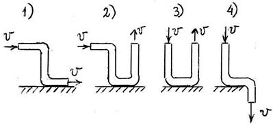 Искомая скорость v max имеет вид v max = Κּωּl. Определить Κ (результат вычисления – с точностью до первого знака после запятой). Κ = …. +: 0,1 I: 239. S: Через участки трубы постоянного сечения и различной формы со скоростью v протекает жидкость заполняющая всё сечение трубы. Направление установившегося движения жидкости указано на рисунке стрелками. Полагая вес участков трубы и заполняющей их жидкости одинаковыми во всех четырёх случаях, установить, в каком из этих случаев сила нормального давления трубы на основание оказывается наибольшей