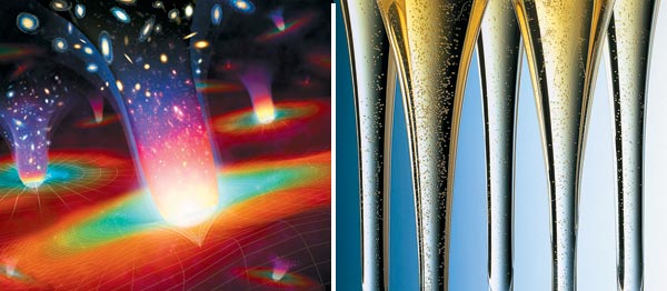 Теория инфляции естественным образом объясняет особенности начального состояния, которые прежде казались такими загадочными. Высокая температура возникает из-за высокой энергии ложного вакуума. Расширение связано с отталкивающей гравитацией, которая заставляет ложный вакуум расширяться, а огненный сгусток продолжает расширяться по инерции. Вселенная однородна потому, что ложный вакуум везде имеет строго одинаковую плотность энергии (за исключением малых неоднородностей, которые связаны с квантовыми флуктуациями в ложном вакууме). Когда теория инфляции впервые была обнародована, ее восприняли лишь как умозрительную гипотезу. Но теперь, спустя 28 лет, она получила впечатляющие наблюдательные подтверждения, большинство из которых связано с космическим фоновым излучением. Спутник WMAP построил карту интенсивности излучения для всего неба и обнаружил, что видимый на ней пятнистый узор находится в безупречном согласии с теорией. Есть и еще одно предсказание инфляции, состоящее в том, что Вселенная должна быть почти плоской. Согласно общей теории относительности Эйнштейна пространство может быть искривлено, однако теория инфляции предсказывает, что наблюдаемая нами область Вселенной должна с высокой точностью описываться плоской, евклидовой, геометрией. Вообразите искривленную поверхность сферы. Теперь мысленно увеличьте эту поверхность в огромное число раз. Это как раз то, что случилось со Вселенной во время инфляции. Нам видна лишь крошечная часть этой огромной сферы. И она кажется плоской точно так же, как Земля, когда мы рассматриваем небольшой ее участок. То, что геометрия Вселенной плоская, было проверено путем измерения углов гигантского треугольника размером почти до космического горизонта. Их сумма составила 180 градусов, как и должно быть при плоской, евклидовой, геометрии. Теперь, когда данные, полученные в наблюдаемой нами области Вселенной, подтвердили теорию инфляции, можно в какой-то степени доверять тому, что она говорит нам о регионах, недоступных для наблюдения. Это возвращает нас к вопросу, с которого мы начали: что лежит за нашим космическим горизонтом?