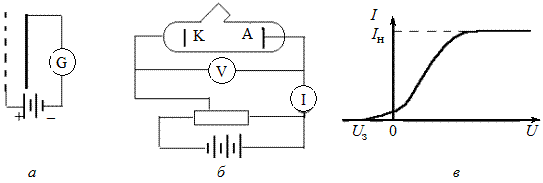 Внешним фотоэффектом, называется испускание электронов веществом под действием света. Это явление было открыто Г. Герцем в 1887 г. Он заметил, что если один из шариков разрядника осветить ультрафиолетовыми лучами, то искра проскакивает между шариками при меньшем напряжении, чем при отсутствии ультрафиолетового излучения. В 1888–1889 гг. А. Г. Столетов провел систематическое исследование явления внешнего фотоэффекта. Исследования выполнялись на установке, схема которой показана на рис 5.1, а. Свет, проходя через сетку, падал на сплошную металлическую пластину. В результате в цепи возникал ток, который регистрировался гальванометром.