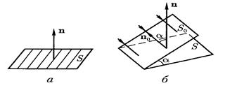 Рис. 2 Предположим, что поверхность S произвольным образом ориентирована в пространстве. Пусть вектор нормали к ней n и падающие световые лучи образуют угол α (рис.2 б). Рассмотрим проекцию площадки площадью S на плоскость, перпендикулярную направлению распространения световых лучей. Площадь этой проекции определится по формуле S0 = S cosα, где α угол между n и n0; n0 - вектор нормали к S0. Как следует из рис. 2 б, угол между нормалями к плоскостям равен углу между плоскостями (углы со взаимно перпендикулярными сторонами). На площадку S падает световой поток Ф= SЕ, где Е -освещенность площадки S, а на площадку S0 –световой поток Ф=Е0S0 или Ф=Е0Scosα где Е0 – освещенность площадки S0. Поскольку на площадку S и на ее проекцию S0 падает один и тот же световое поток Ф, имеем ЕS=Е0S0 cosα. Отсюда следует, что Е = E0 cosα. (8). Формула (8) выражает второй закон освещенности: освещенность поверхности, создаваемая параллельными лучами, пропорциональна косинусу угла падения лучей. Значение Е0 можно определить по формуле (7), так как площадка S0 расположена перпендикулярно падающим световым лучам. Подставив (7) в (8), получим формулу, объединяющую первый и второй законы освещенности: