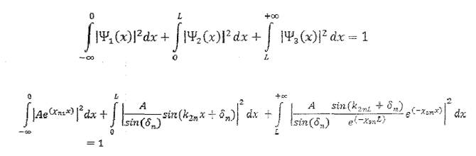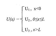 Чтобы описать движение квантовой частицы, решение уравнения Шрёдингера найдём сначала в отдельных областях 1, 2 и 3, затем потребуем непрерывности волновой функции и её производной на границах областей, в точках х = 0 и х = L