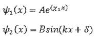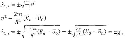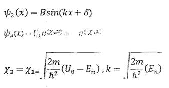 действительная величина Решение дифференциального уравнения здесь А1 и А2 - произвольные постоянные. Решение в области 2: Решение этого уравнения имеет вид: где корни характеристического уравнения, которое в данном случае имеет вид: Корни характеристического уравнения мнимые: действительная величина Решение дифференциального уравнения: Это решение можно представит в действительной форме: В области 3 решение находим аналогично решению в области 1: Получили решения-уравнения Шрёдингера областях 1, 2 и 3:
