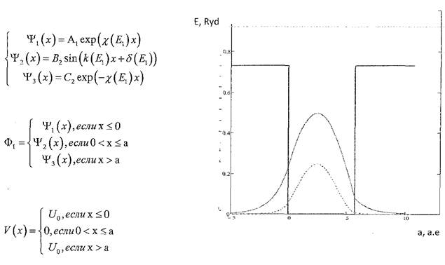 (2.11) И аналогично для других формул. Алгоритм решения задачи: 1. Рассмотрим квантовую яму без возмущения, случай, когда собственные значения энергии электрона меньше, чем глубина потенциальной ямы обеих стенок - исходя из граничных условий, решим трансцендентное уравнение и найдем набор собственных значений энергии электрона; - запишем волновую функцию и пронормируем ее для нахождения одной из произвольных констант; - построим графики зависимости волновой функции и вероятности обнаружения частицы в той или иной точки от собственных значений энергии. 2. Решим задачу с возмущением, для этого: - найдем поправки к энергиям; - найдем поправки к волновым функциям; - построим графики зависимости волновой функции и вероятности-обнаружения частицы в той или иной точки от собственных значений энергии. 3. Сделаем выводы по полученным результатам.