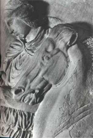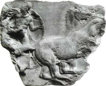 56 имена скульпторов, трудившихся над декорированием храма, но, поскольку статуя Афины была создана Фидием, скорее всего, и другие работы выполнялись его мастерской. На илл. 56 и 57 показаны фрагменты фриза, опоясывающего внутреннюю часть (целлу) здания. На нем изображена процессия, проходившая на ежегодных празднествах в честь богини. Торжества сопровождались играми и состязаниями. На приведенном фрагменте запечатлен момент упражнения в ловкости: возничий, управляя колесницей, на полном ходу выпрыгивал из повозки и снова вскакивал в нее. Из-за сильных повреждений рельефа в нем не просто разобраться. Не только сколота часть поверхности, но и полностью исчезла интенсивная раскраска фона, выделявшая фигуры с особой отчетливостью. На современный взгляд цвет и фактура мелкозернистого мрамора настолько привлекательны, что нет надобности закрашивать его. Но греки прибегали к контрастным цветам, вроде сочетания красного и синего. Однако, имея дело с греческой пластикой, не стоит портить себе удовольствие сожалениями об утратах, как бы велики они ни были. Первое, что мы замечаем на нашем фрагменте, - четыре лошади, расположенные одна позади другой. Их головы и ноги хорошо