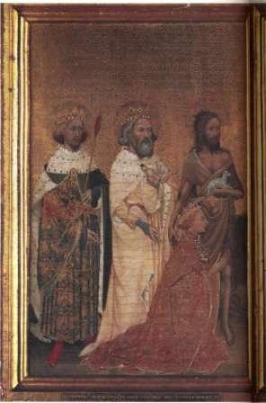 142 многое в картине говорит о том, что новации Джотто не прошли мимо них. Ваза имеет реальный объем и стоит на реальном каменном полу, место ее расположения по отношению к фигурам ангела и Марии не вызывает сомнений. Скамья, на которой сидит Мария, тоже вполне реальна - ее края сужаются в глубину. Книга - уже не отвлеченный знак книги, а реальный молитвенник, с освещенной обложкой и затененными страницами внутри - видимо, художник изучал его форму у себя в мастерской. Джотто был современником великого флорентийского поэта Данте, и в Божественной комедии упоминается его имя. Симоне Мартини, создатель вышеприведенного алтарного образа, дружил с Петраркой, величайшим итальянским поэтом следующего поколения. В наши дни Петрарка известен главным образом как автор любовных сонетов, обращенных к Лауре. Из них мы узнаем также, что поэт высоко ценил портрет Лауры, написанный Симоне Мартини. Напомним, что Средневе ковье не знало собственно портрета, довольствуясь условной фигурой с обозначенным под ней именем. Портрет Лауры работы Симоне Мартини, к сожалению, утрачен, и мы не можем судить о степени его сходства с моделью. Однако, известно, что этот художник, как и другие его современники, работал с натуры, и именно в это время стали появляться портреты. Симоне Мартини, со свойственным ему вниманием к подробностям реального мира, внес свой вклад в становление портретного жанра. С его произведениями имели возможность познакомиться художники Европы - как и Петрарка, он провел многие годы при папском дворе, пребывавшем в то время не в Риме, а на юге Франции, в Авиньоне. Франция все еще сохраняла лидирующую роль в европейском искусстве, нарождавшиеся здесь идеи и стилевые течения повсюду имели огромное влияние. В Германии того времени властвовала династия Люксембургов с резиденцией в Праге. В пражском соборе есть необычная серия бюстов, относящихся к 1379-1386 годам. Это портреты людей, сделавших пожертвования собору, то есть в данном отношении они аналогичны статуям наумбургских донаторов (стр. 194, илл. 130). Однако на сей раз нет повода для сомнений - это настоящие портреты. В серию вошли бюсты современников, в том числе и портрет выполнявшего их художника - Петра Парлержа (1330 - 1399). По всей видимости, это самый ранний из известных нам автопортретов (илл. 142). Богемия к тому времени приобрела важное значение передаточного центра, через который распространялись итальянские и французские влияния. Когда Ричард II вступил в брак с Анной Богемской, установились и связи Богемии с Англией. Европа, по крайней мере католическая Европа, все еще представлялась единой большой страной. И сами художники, и их творческие начинания свободно перемещались из края в край, и никому не приходило в голову отвергать те или иные новшества по причине их «иностранного» происхождения. Стиль, сложившийся к концу XIV века в результате такого взаимообмена, получил название «интернационального». Его превосходный образчик в Англии - так называемый Уилтонский диптих, созданный, видимо, французским мастером по заказу английского короля (илл. 143). Он интересен во многих отношениях, в частности тем, что здесь дан портрет реального исторического лица - короля Ричарда II, несчастного супруга Анны Богемской. Мы видим его преклонившим колена в молитве; Иоанн Креститель и двое святых, патронов кор