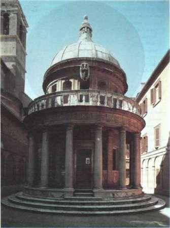 186 Бронза. Диаметр 5,6 см Образованные зодчие мечтали об ордерных храмах и триумфальных арках, от них же требовались городские дворцы и церкви. Мы уже видели, как разрешил это противоречие Альберти, облачивший современное палаццо в одеяния античного ордера (стр. 250, илл. 163). Воображение итальянских архитекторов вдохновлялось самостоятельной, безотносительной к функции красотой - красотой пропорций, наружных объемов и внутренних пространств. Их влекло совершенство симметрии и формальной упорядоченности, недостижимое при исполнении практических требований. Но наступил поистине исторический момент, когда одному из них удалось найти могущественного заказчика, который согласился пожертвовать и традицией, и целесообразностью ради того, чтобы новое сооружение, затмив семь чудес света, прославило бы его имя в веках. Только так можно объяснить принятое в 1506 году папой Юлием II решение снести древнюю базилику Святого Петра и водрузить на этом месте - по преданию, месте погребения апостола -новое сооружение, ниспровергавшее вековые обычаи церковного строительства и богослужения. Осуществление этого плана было доверено Донато Браманте (1444 - 1514), страстному поборнику нового стиля. О том, насколько глубоко впитал Браманте дух античной архитектуры,