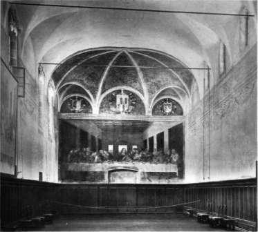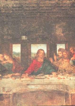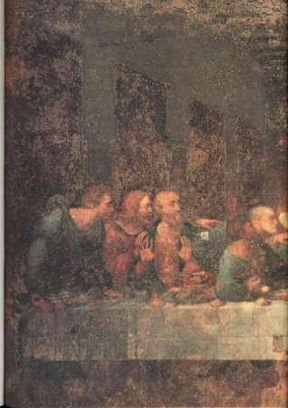 190 Бумага, итальянский карандаш, перо, к ней интерес - ведь вокруг было столько заманчивых загадок, требующих его внимания. По воле слепого случая те редкие работы, которые в период творческой зрелости были доведены Леонардо до конца, дошли до нас в очень плохой сохранности. По остаткам полуразрушенной стенописи Тайная вечеря (илл. 191-192) можно лишь догадываться, какой она была в первозданном состоянии. Композиция располагается на торцовой стене вытянутого зала, бывшей трапезной миланского монастыря Санта Мария делле Грацие. Надобно вообразить себе тот момент, когда роспись была открыта и монахи увидели Христа и апостолов, сидящих за столом, рядом с их собственными столами. Никогда прежде живопись