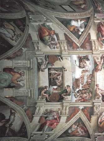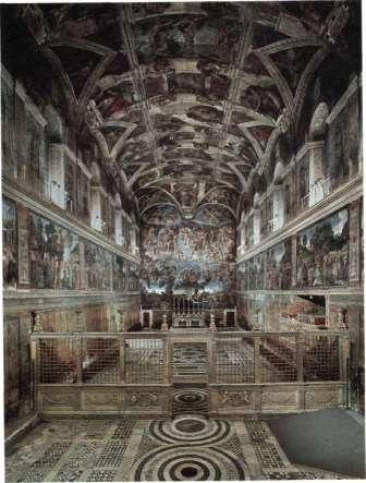 196 Общий вид интерьера до расчистки фресок их в статуи, каких еще не видывал мир. Он провел в карьерах более полугода, отбирая материал, делая закупки, и в голове его теснились образы, которые словно ожидали его резца, чтобы высвободиться из каменного плена, где они пребывали в забытьи. Вернувшись в Рим и приступив к работе, он вскоре обнаружил, что энтузиазм папы заметно угас. Теперь мы знаем, что причиной тому было противоречие в строительных планах Юлия II: гробница предназначалась для старого собора Святого Петра, подлежавшего сносу, а другого места для нее не было. Но Микеланджело, претерпев ужасное разочарование, заподозрил заговор. Ему казалось, что против него плетут интригу, что соперники, во главе с архитектором собора Браманте, вознамерились отравить его. Обуреваемый яростью и страхом, он покинул Рим и из Флоренции отправил Юлию II дерзкое послание, в котором заявил, что если папа нуждается в нем, то пусть самолично за ним приедет. Как Микеланджело удалось совершить то, что он сделал за четыре года работы в папской капелле, с трудом поддается человеческому разумению (илл. 198). Его труд кажется невероятным даже с точки зрения физических усилий, необходимых для росписи такого масштаба, с предварительной работой над эскизами и картонами*. Он писал, лежа на спине, и настолько свыкся с этим неудобным положением, что даже письма читал, запрокинув голову. Однако сила художественного мышления, представшая в этих фресках, заставляет забыть о вложенном в них титаническом труде. Внутренние озарения, воплощенные в безупречной, филигранно отточенной форме, стали откровением и для современников, и для последующих поколений, явив миру неведомую дотоле мощь человеческой гениальности. Из репродукций может возникнуть впечатление перегруженности потолка обилием фигур. Однако при входе в капеллу поражает как раз соразмерность росписи архитектурному окружению, декоративная ясность ее членений. Когда в 1980 году фрески были очищены от слоев сажи и пыли, их краски предстали в той светоносной яркости, которая была необходима в условиях слабого освещения через узкие и немногочисленные окна. (Это обстоятельство редко учитывается сейчас, когда мы рассматриваем фрески при сильной электрической подсветке, направленной на потолок.)
