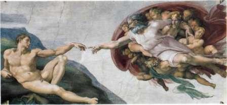199 Бумага, сангина 28,9x21,4 см косвенным воздействием сикстинских фресок. Самая известная и, пожалуй, самая впечатляющая из них - Сотворение Адама (илл. 200). Иконографический тип - Бог прикосновением руки вызывает к жизни лежащего Адама - существовал в изобразительном искусстве задолго до Микеланджело. Но под его кистью словно предстали воочию вдохновенные силы божественного созидания. Внимание целиком сосредоточено на двух фигурах: распростертый на земле Адам, наделенный первозданной красотой и силой, и летящий к нему Создатель. Пронзающий пустоту стремительный полет вздымает плащ, как парус на ветру. Повинуясь властному жесту господней руки, еще не коснувшейся пальцев Адама, первочеловек восстает от оков сна, устремив взор к отеческому лицу Творца. Микеланджело совершил чудо, явив идею творческого всемогущества в этом встречном движении двух рук - смысловом центре и композиционном фокусе фрески. Тем, кто полагал, что изнурительная работа в капелле истощила творческие силы Микеланджело, вскоре пришлось убедиться в обратном. При соприкосновении с любимым материалом его воображение вспыхнуло с новой силой. В Сотворении Адама животворные силы поднимают спящего с земли, в Умирающем рабе жизнь увядает, ее токи