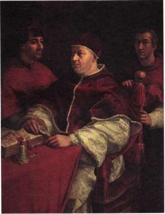 206 Дерево, масло 155,5 х 119 см мифологии, возможно, удивит портрет папы Льва X - патрона художника из рода Медичи {илл. 206). Рафаэль запечатлел его в компании двух кардиналов, в момент, когда он только что оторвался от книги (этот большой манускрипт напоминает по стилю Псалтирь королевы Марии, стр. 211, илл. 140). Отечное лицо пожилого близорукого человека передано без всякой идеализации. Пышные облачения из бархата и парчи придают портрету торжественность, но в лицах ощущается какая-то тревога. Это были и в самом деле беспокойные времена. Как раз в период создания портрета Лютер выступил против папы с обвинениями в расточительстве, в неумеренных тратах на строительство собора Святого Петра. Когда в 1514 году скончался Браманте, Лев X поручил Рафаэлю продолжить работу над этим грандиозным проектом. Овладев профессией архитектора, Рафаэль строил церкви, виллы и дворцы, изучал памятники Древнего Рима. В противоположность Микеланджело, он умел ладить с людьми, и его мастерская всегда была загружена работой. Будучи учтивым, светским человеком, он сблизился с учеными-гуманистами и вошел в круг папского двора. Уже ходили слухи, что он станет кардиналом, когда его жизнь внезапно оборвалась. Рафаэль прожил тридцать семь лет, чуть дольше Моцарта, и за этот скупо отмеренный судьбой срок успел сделать поразительно много, подняться к высшим творческим свершениям. Кардинал Бембо, один из известнейших ученых того времени, написал эпитафию для гробницы Рафаэля в римском Пантеоне: