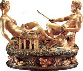 Федерико Цуккаро Окно палаццо Цуккаро в Риме. 1592 центральной цилиндрической части, напоминающей римский Пантеон (стр. 120, илл. 75). Как бы ни была красива такая композиция, здание мало пригодно для обитания. Погоня за необычными эффектами вступила в противоречие с утилитарным назначением архитектуры. Типичный представитель маньеристической эпохи - флорентийский скульптор и ювелир Бенвенуто Челлини (1500 - 1571). В написанной им автобиографической книге встают колоритные картины жизни того времени. Челлини был хвастлив, жесток и тщеславен, но история его приключений написана так увлекательно, что ее читаешь, как роман Дюма, и прощаешь автору его пороки. Сама эпоха запечатлелась в личности Челлини - человека суетного и самовлюбленного, неугомонного в своих метаниях по городам и весям, монаршим резиденциям, где ему доставались и величальные лавры, и бранные поношения. Он уже не мог быть оседлым респектабельным владельцем мастерской; художник в его понимании - это блистательный «виртуоз», обольщающий своим искусством светских и церковных владык. Немногие его работы дошли до нас, и самая известная среди них - золотая солонка, выполненная в 1543 году для французского короля (илл. 233). Челлини подробно рассказал историю ее создания. Из его книги мы узнаем, как он отчитал двух