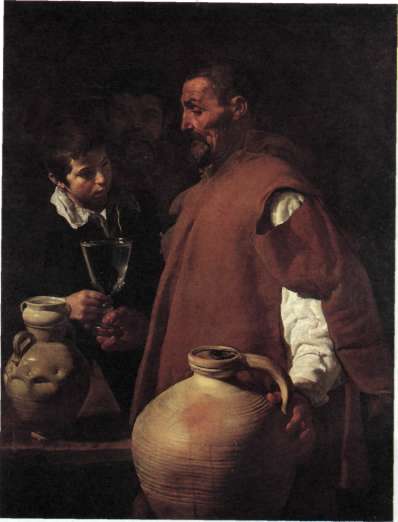 263 Холст, масло 106,7x81 см в Италии, однако видел картины последователей Караваджо, и они произвели на него сильное впечатление. Под их воздействием Веласкес примкнул к «натуралистическому» течению, предавшись пытливому и беспристрастному наблюдению натуры. В одной из его ранних работ изображен севильский продавец воды (илл. 263). Картина относится к бытовому жанру, основанному нидерландцами, но по характеру исполнения она гораздо ближе Неверию Фомы Караваджо (илл. 252). Морщинистое, загрубевшее на солнце лицо старика, его рваный плащ, крутобокий глиняный кувшин, бокал с прозрачной водой переданы с такой убедительностью, что зрительные ощущения переходят в осязательные. Перед такой картиной не задаешься вопросом о красоте изображенных объектов, забываешь о «высоком» и «низком». Колористическая гамма, в которой доминируют неброские коричневые, серые, зеленоватые тона,